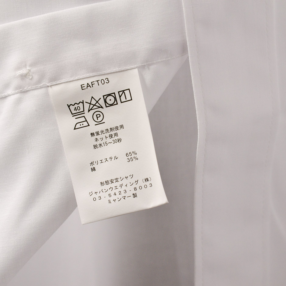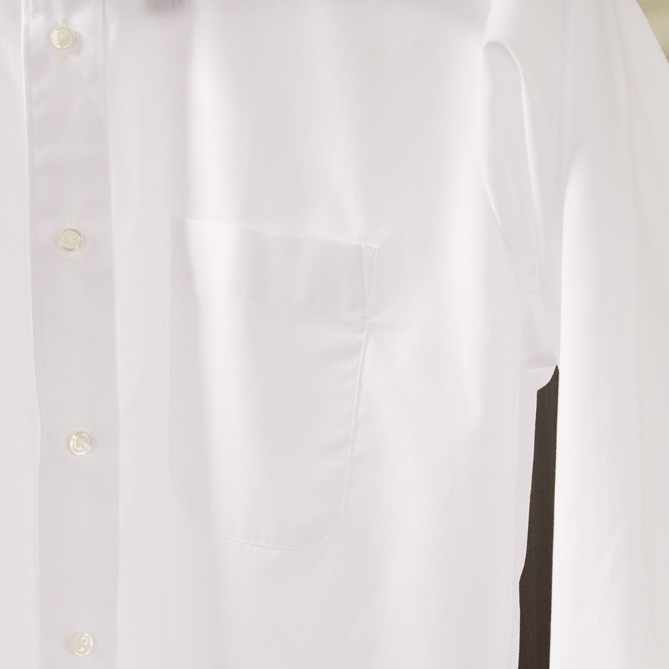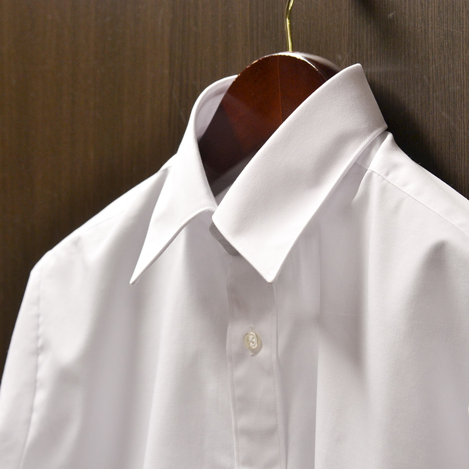 白のレギュラーカラーのワイシャツ、タキシードステーションオリジナルの定番ビジネスシャツです。首廻り×ゆき丈の幅広いサイズでご注文頂けます。定番のブラックスーツから冠婚葬祭の着こなし、お父様モーニングにも最適なフォーマルシャツです。シングルカフスのデザインは、結婚式でもお召頂けますのでご安心ください。首廻り45cmと47cmの大きなサイズはゆき丈が86cmのご用意となりますので、ゆき丈が合わないお客様は長い方をご選択頂き、アームバンドの追加をお勧めいたします。