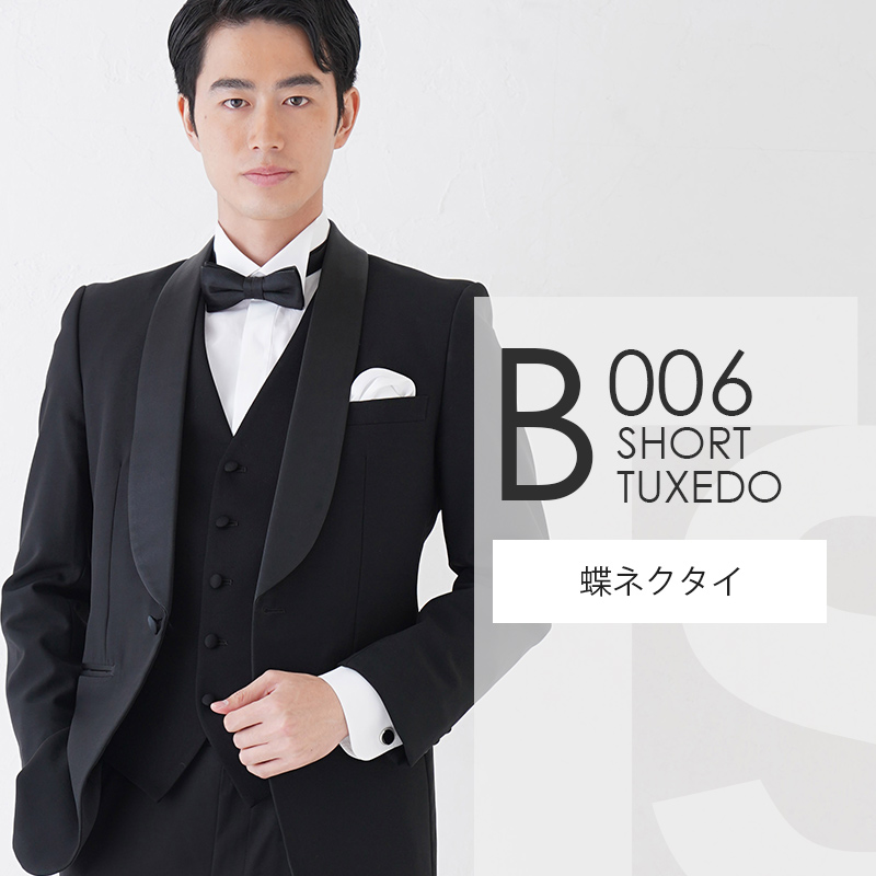 黒、ショールカラーのタキシード。新郎向けのスタイリッシュパターンにブラックのラペル施した、映画のワンシーンのようなネオクラシコモデル。
