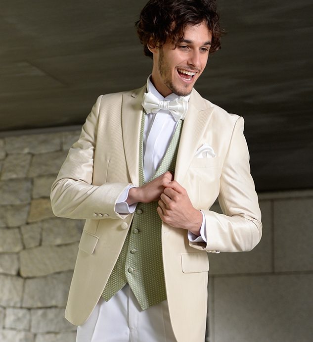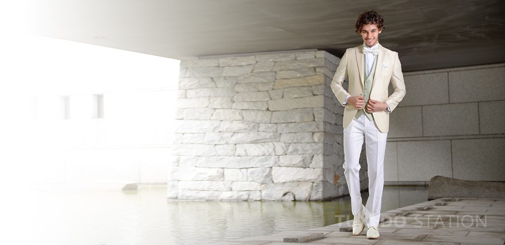 リゾート挙式の定番「白」タキシードも素敵ですが、ベージュとオフホワイトの組み合わせで