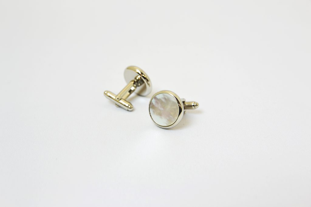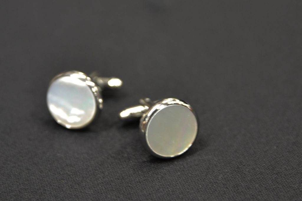 正礼装の燕尾服(テイルコート)やモーニングコートを着る場合、白蝶貝のカフスボタンをつけるのが一般的です。白蝶貝はジャケットやシャツのボタンとしても知られ、真珠の親貝と呼ばれる、二枚貝です。高瀬貝などの種類もありますが、巻貝である高瀬よりも、白蝶は1つの貝から取れるボタンの量が少なく、希少なため高価です。光に反射しる美しい独特の光沢も、天然素材の良さですね。