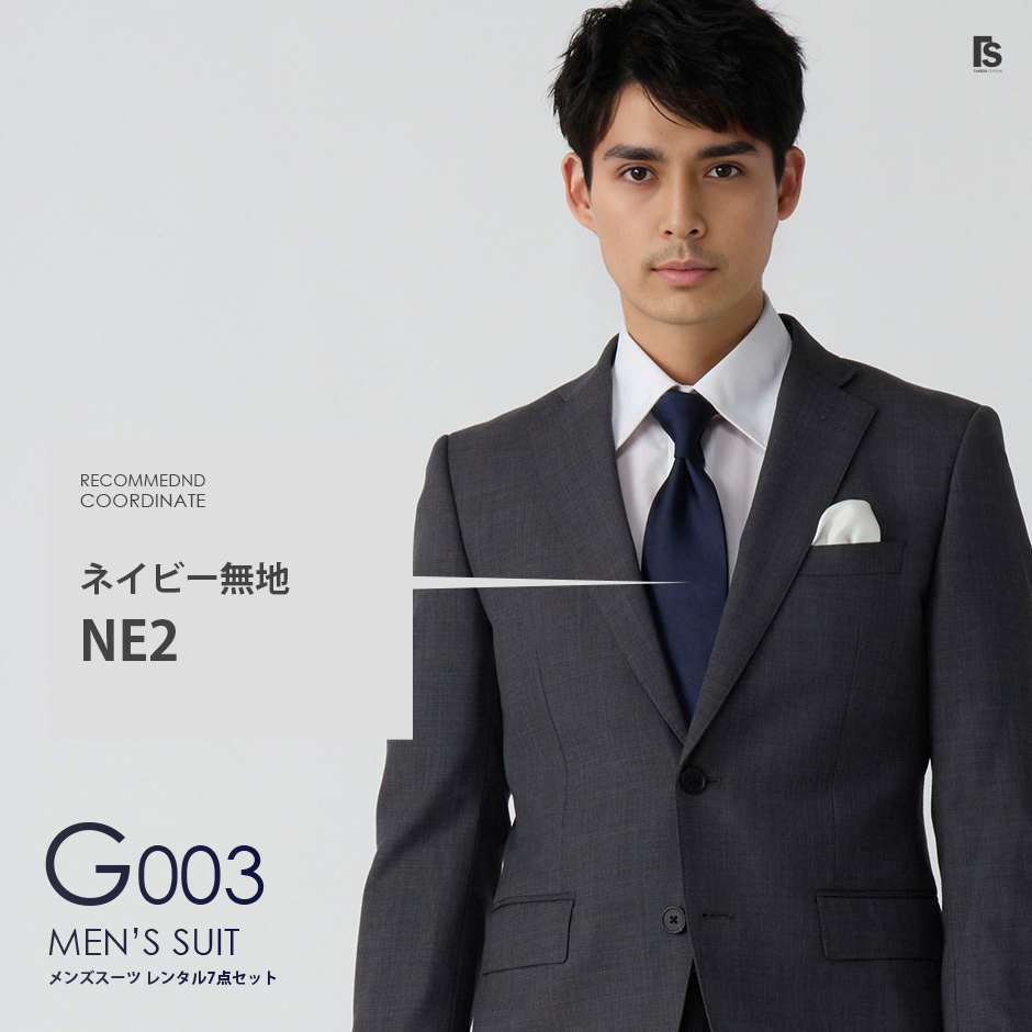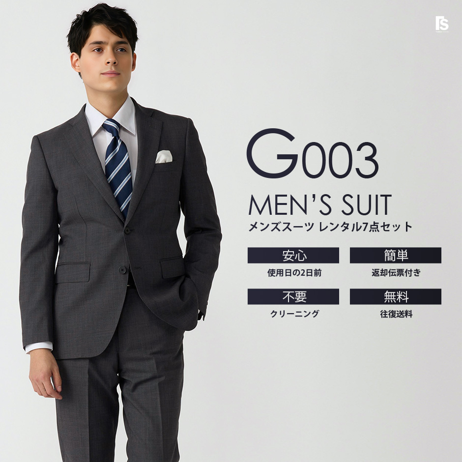 レンタルセットには、「ジャケット、パンツ、レギュラーカラーシャツ、ネクタイ、チーフ、ベルト、カフスボタン」が付属されます。 ※オンライン注文は2種類です