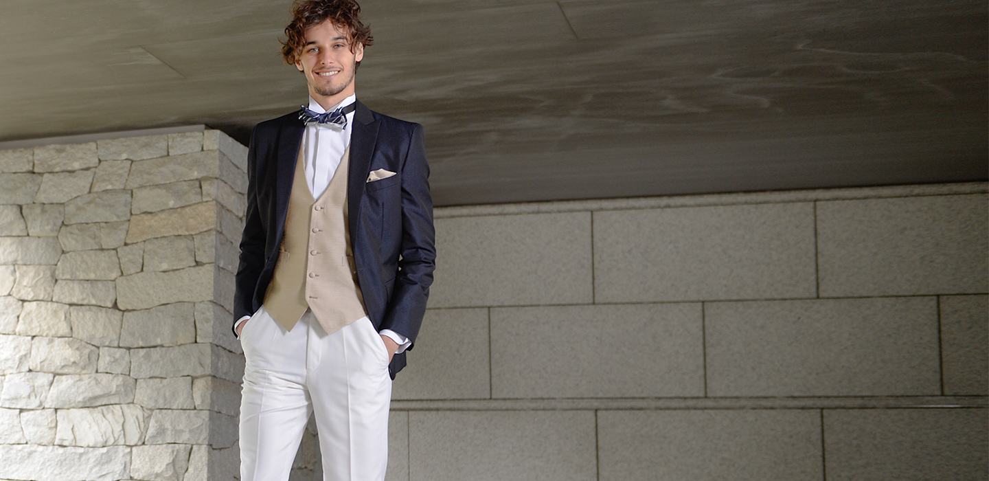 リゾート感抜群のホワイトパンツのセットアップが新登場。光沢あるダークネイビーに上品なシャンパンベージュのインナーアクセサリー。
